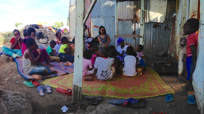 Shirley set up a Street Library in a neighbourhood of Mayotte.* This activity welcomes a lot of primary school children who do not know how to read but who like listening to stories. Parents and children increasingly get involved in this activity.