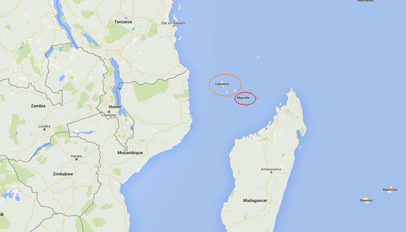 * The Comoro Islands are in the Indian Ocean, located between the northeast coast of Mozambique and the northwest coast of Madagascar. While Comoros is an independent state, the island of Mayotte is part of France.