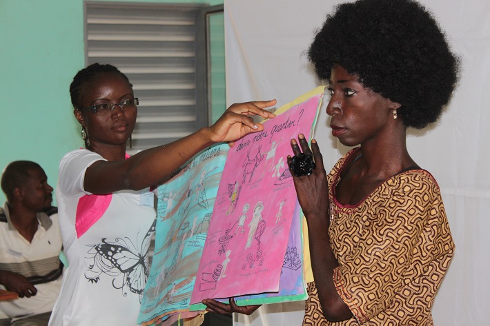 By acting out these situations with Forum theatre, many ideas were sparked. To broaden understanding of their activities, the young people encouraged one another: to approach village leaders and other authorities; to recruit some parents to share information with their neighbours; or to facilitate activities in tandem. When there is a pair of facilitators, one can focus on running the activity with children, while the other can be more attentive to the group dynamics, looking out for a child who may be left out or disruptive, and speaking with parents when they happen to pass by.